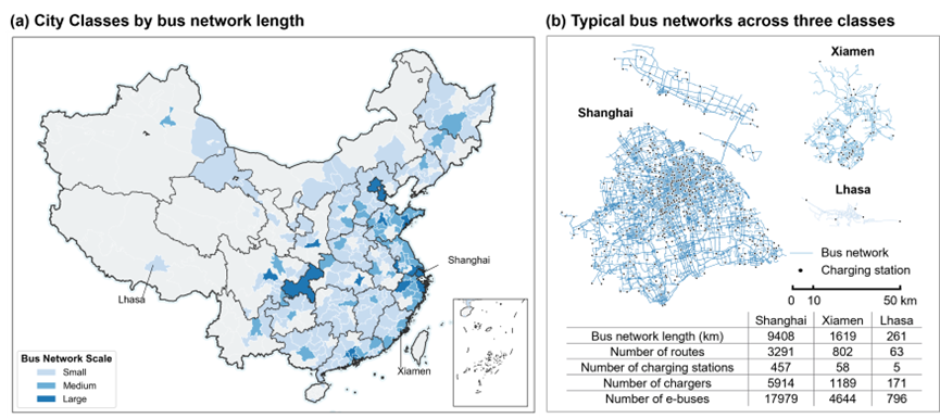 Fig. 1 | Representative typologies of urban bus networks across Chinese cities. a, Chinese cities are classified into three groups according to bus network length, revealing substantial inter-city variation in network scale. b, Representative bus networks from the three classes—Shanghai, Xiamen and Lhasa—illustrate marked differences in network extent, route structure and charging-station deployment.
