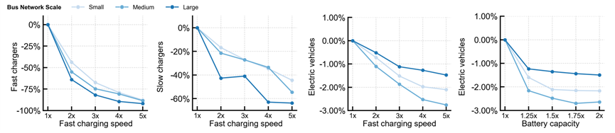Under technology improvement scenarios, electrification strategies diverge across bus networks of different sizes: large networks show greater potential to reduce charger deployment, whereas medium-sized networks can achieve larger reductions in the required fleet size.